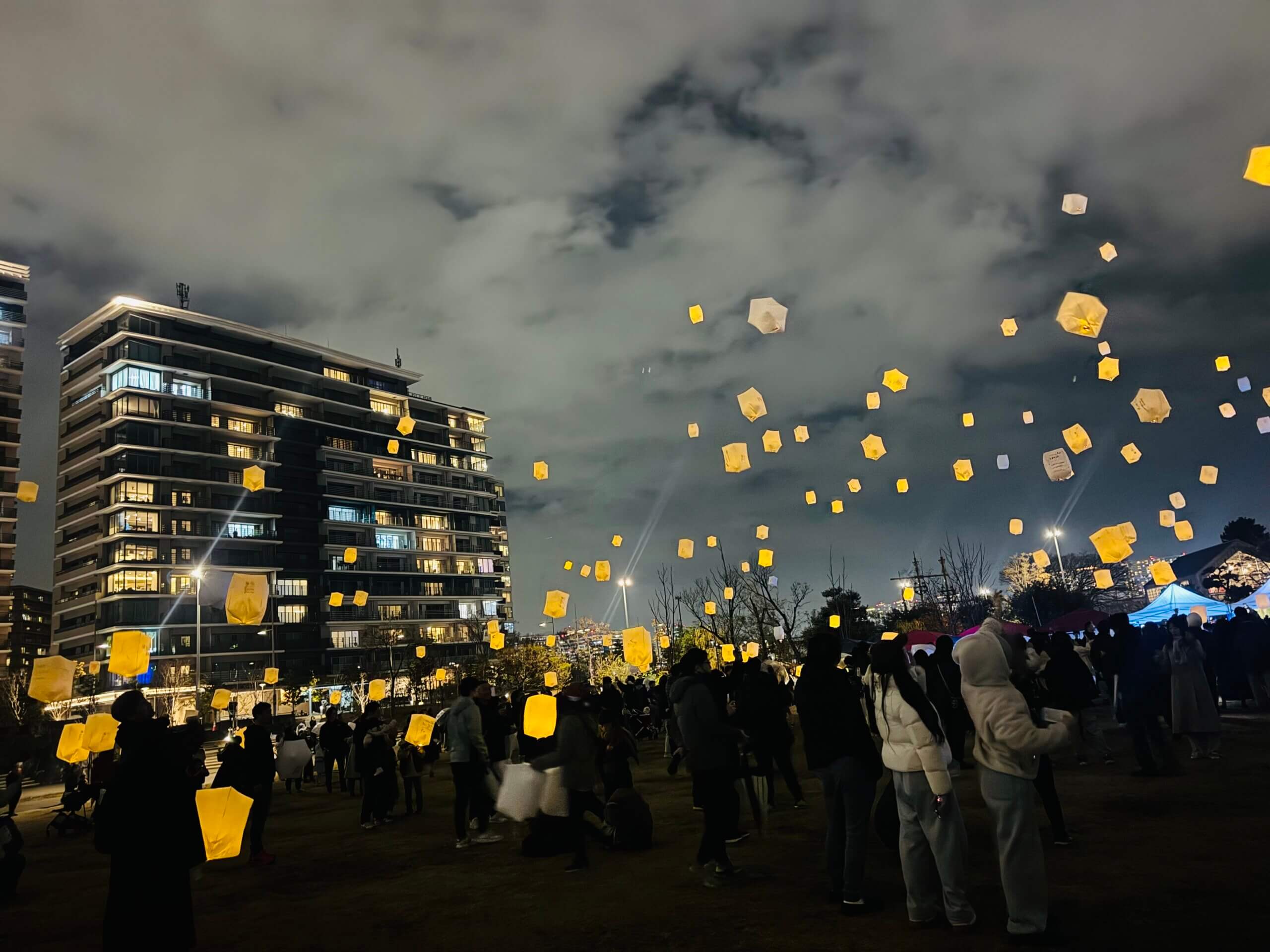 夜の公園に集まって、ワイワイしながら願いごとを空に飛ばす。