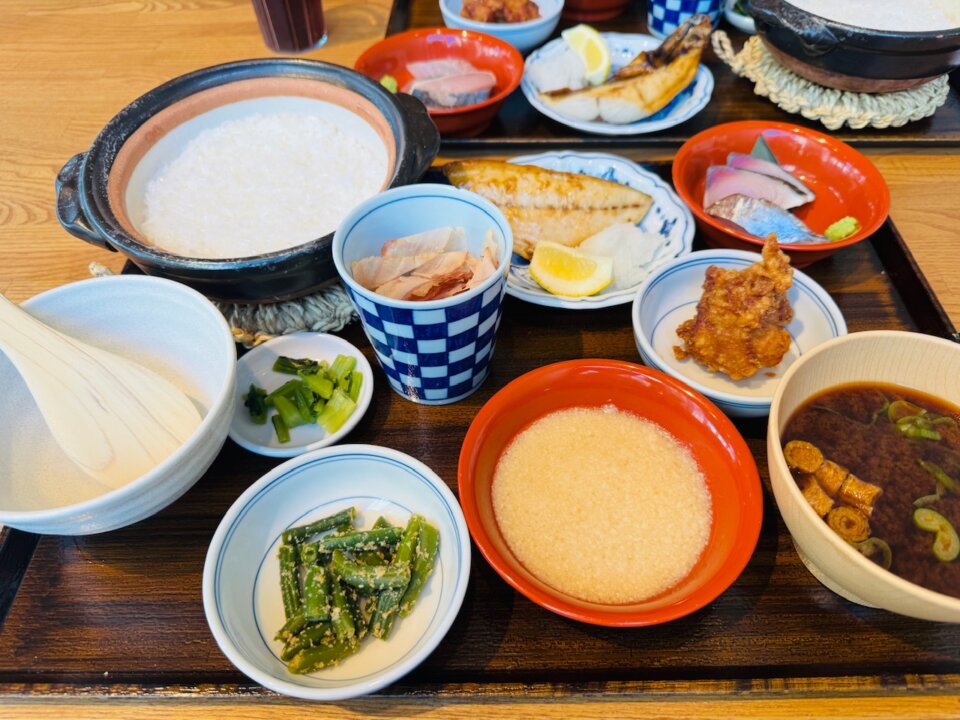 - おかずが5〜6種類(お刺身・焼き魚・唐揚げ・おひたし・とろろ)